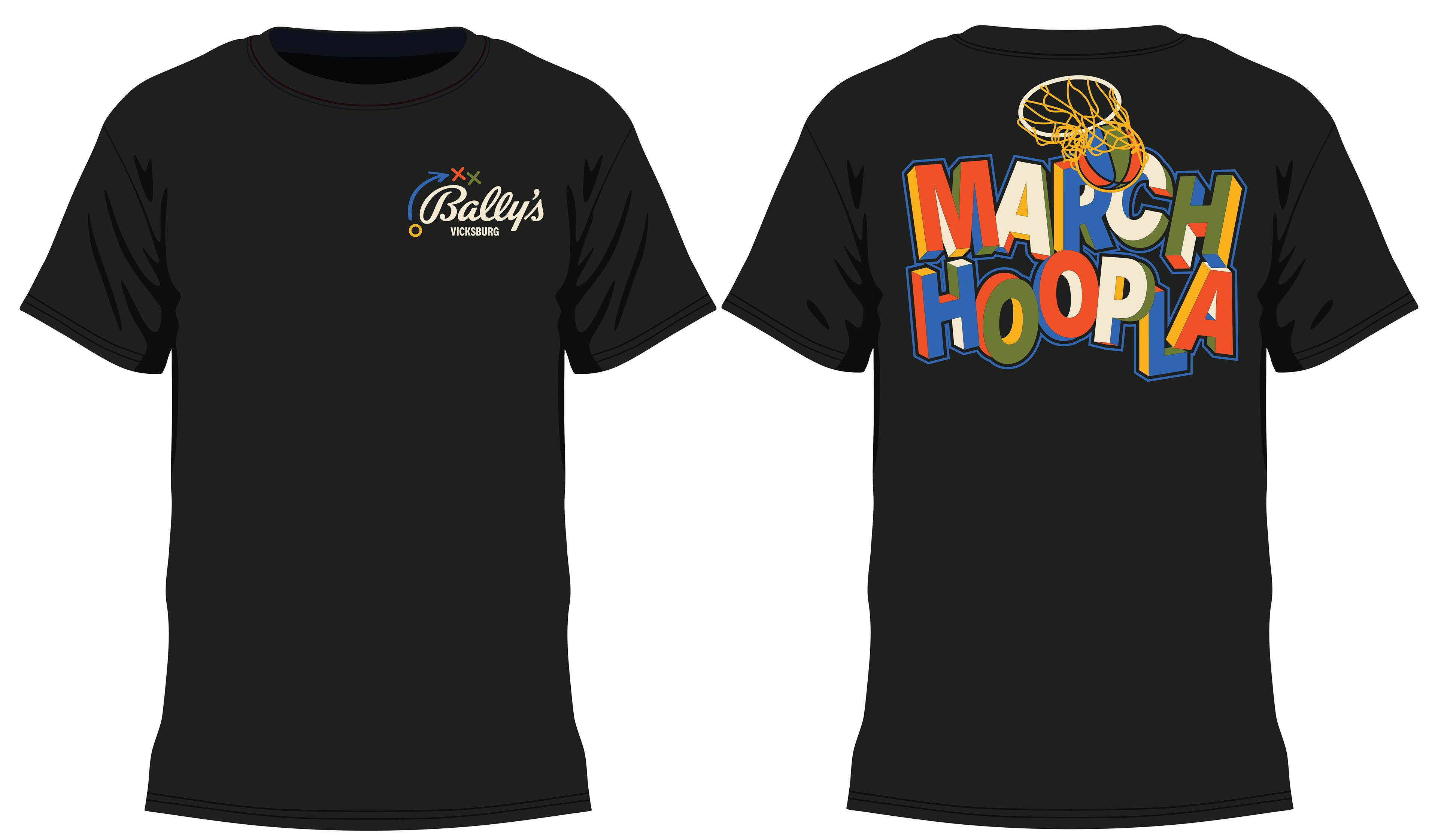 The front features a clean Bally’s Vicksburg logo with playful court-inspired graphics, giving the shirt a sporty yet polished look. Turn it around and the celebration really begins - an oversized “March Hoopla” graphic explodes with vibrant colors, layered lettering, and a basketball swishing through the net, capturing the thrill of buzzer beaters and bracket battles.
