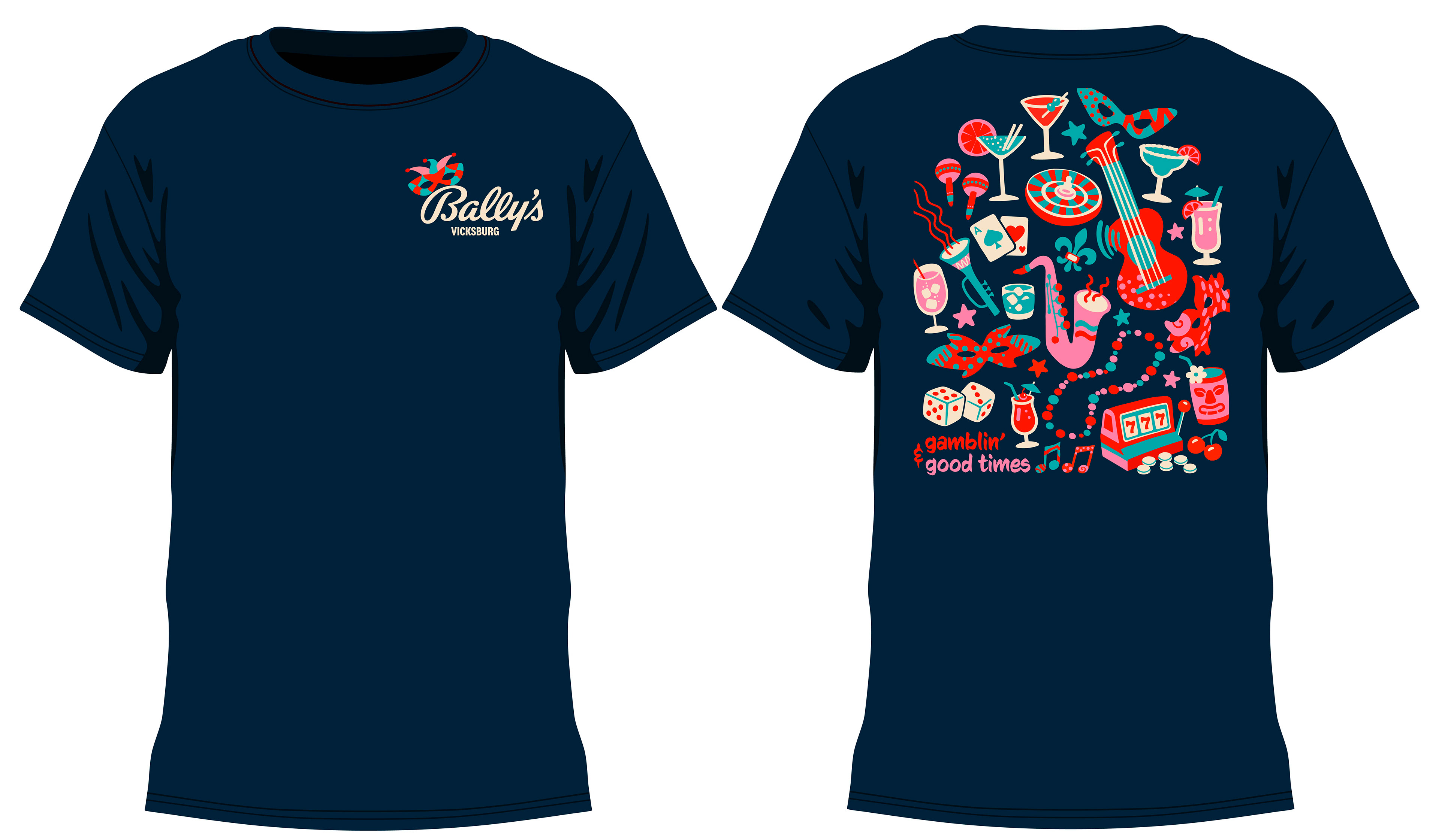 Bring the spirit of Mardi Gras wherever you go with this vibrant, eye-catching graphic tee. Designed with a dynamic mix of playful illustrations, and rich carnival-inspired colors, this shirt captures the energy and excitement of celebration culture. The design features bold, iconic Mardi Gras motifs - beads, masks, stars, and lively accents; combined with recognizable casino motifs - arranged in a collage-style composition that feels both modern and nostalgic. Teals, bright pink, vibrant coral, with an offwhite accent pop against the dark blue fabric, creating a look that’s fun, expressive, and full of personality. Celebrate loud. Dress bold. Let the good times roll.