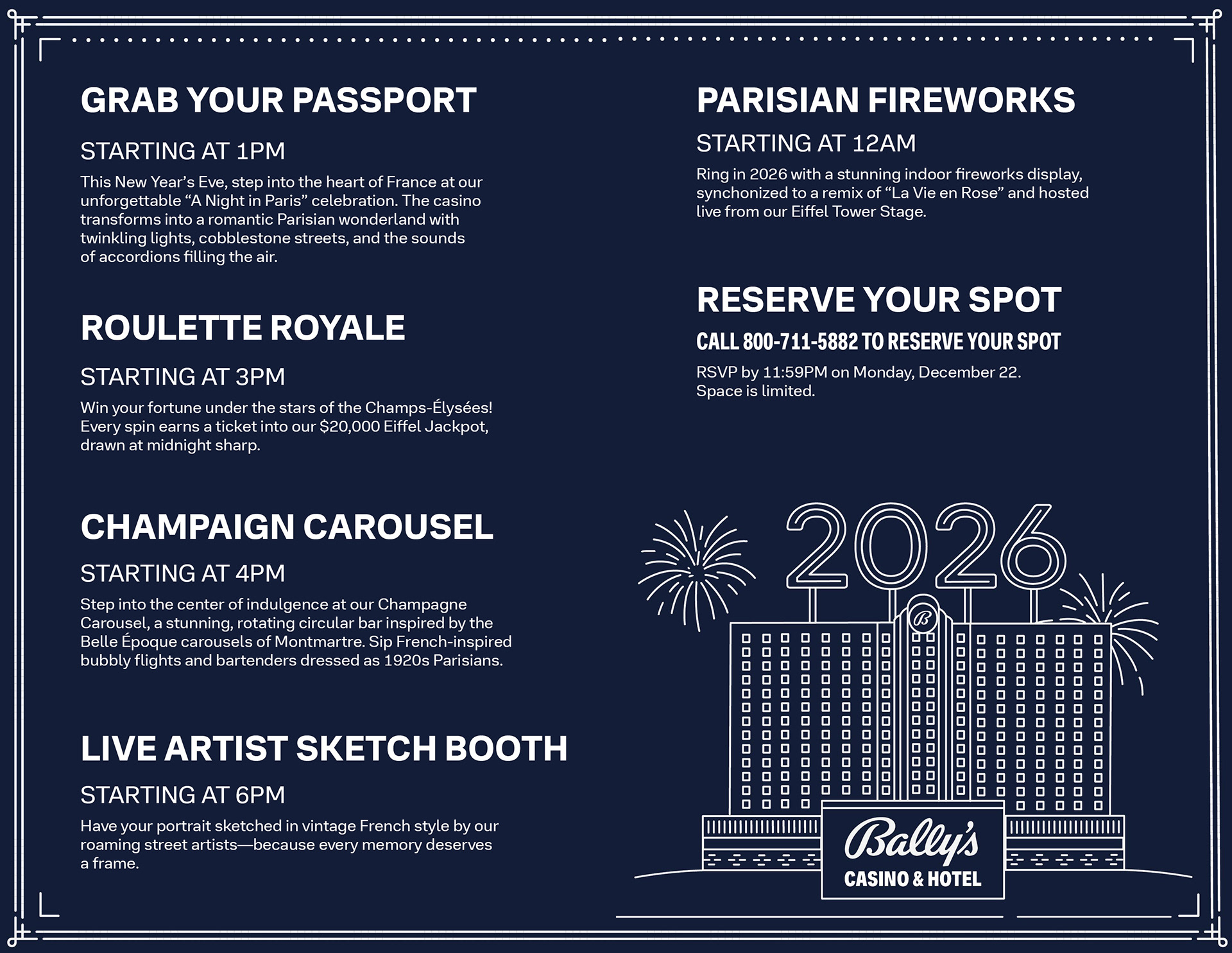 This was a concept created for a Bally's New Year's Eve Invitation. It was created using various landmarks in both Paris and in the casino world - with influences from contemporary mono-line design work. It's an example of contemporary Art Deco revival, with influences from both mid-century French poster design and modern minimalism.