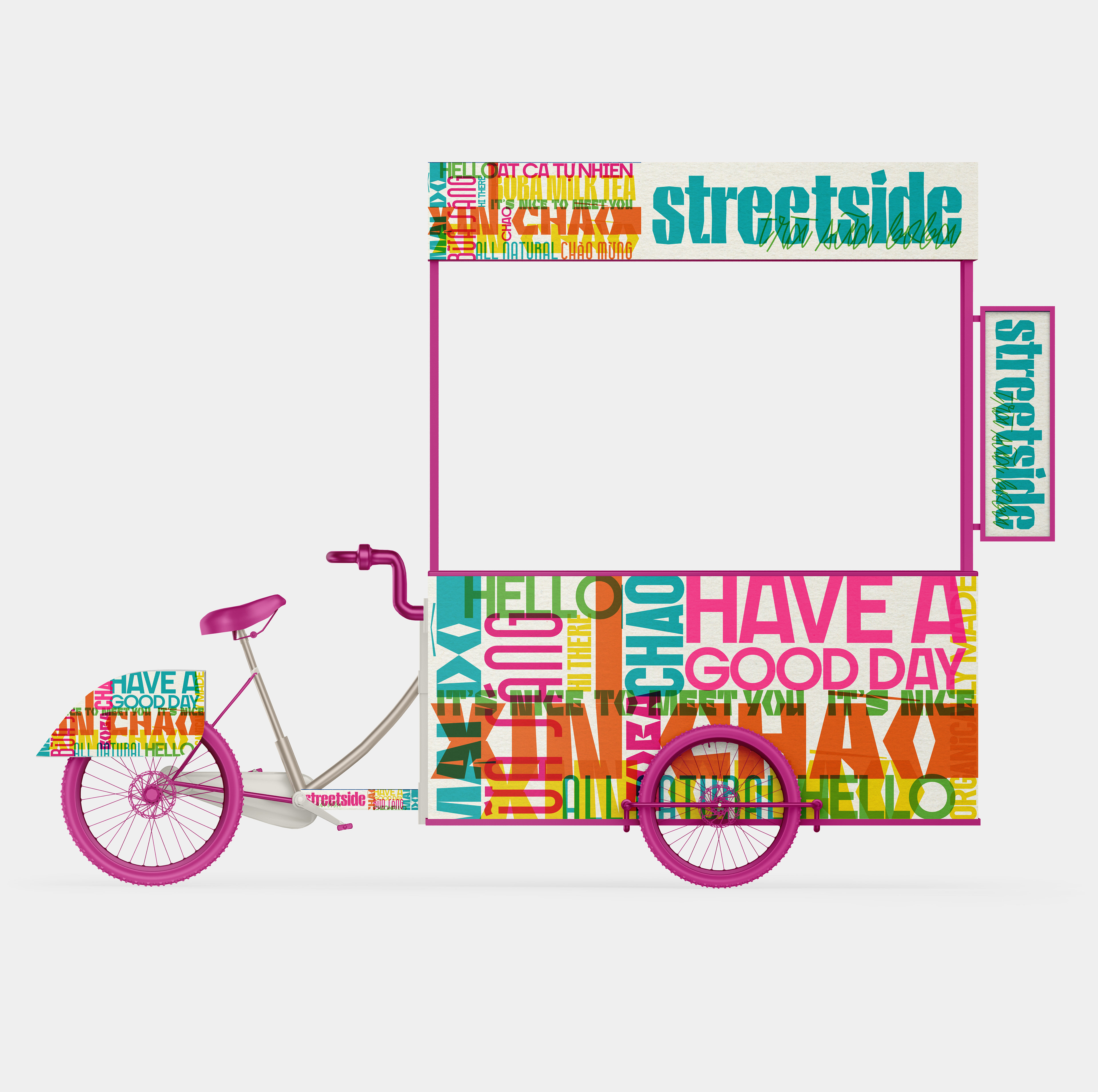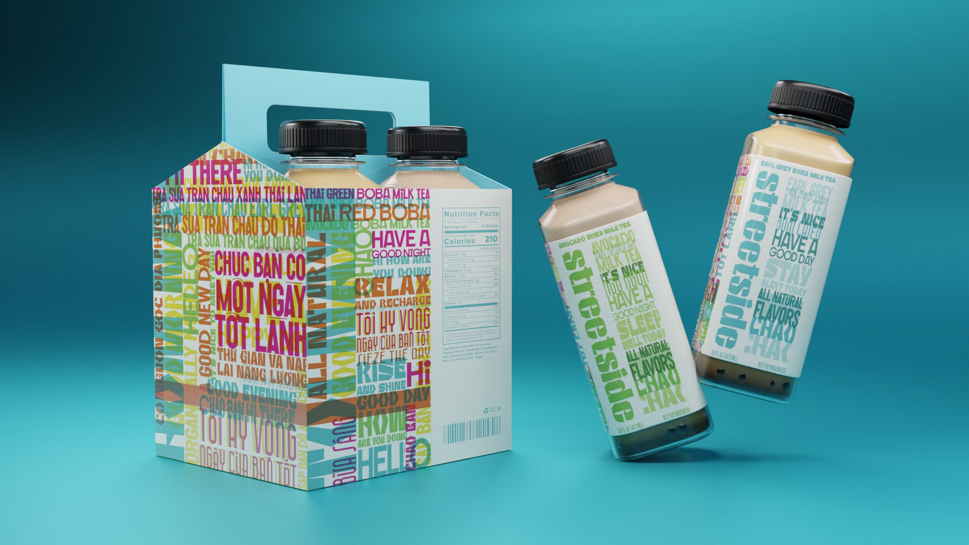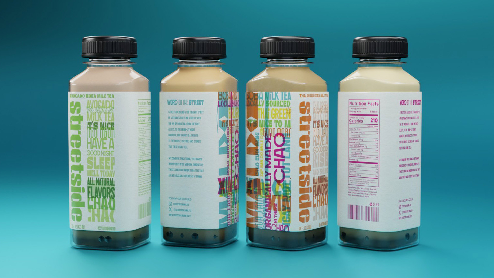 Streetside is a Vietnamese-inspired boba tea brand that captures the energy, warmth, and color of Vietnam’s bustling street culture. The brand draws direct inspiration from Vietnamese street signs - their layered typography, bright palettes, and handwritten charm. The phrases printed on the bottles - such as “It’s nice to meet you”, “Have a good day”, and “Chào” - are real greetings and expressions that vendors often say to tourists, making every bottle feel like a friendly moment shared on the street. Visually, the identity embraces bold typographic compositions, overlapping languages, and vibrant, contrasting hues to evoke the atmosphere of Saigon’s night markets and Hanoi’s bustling alleys.