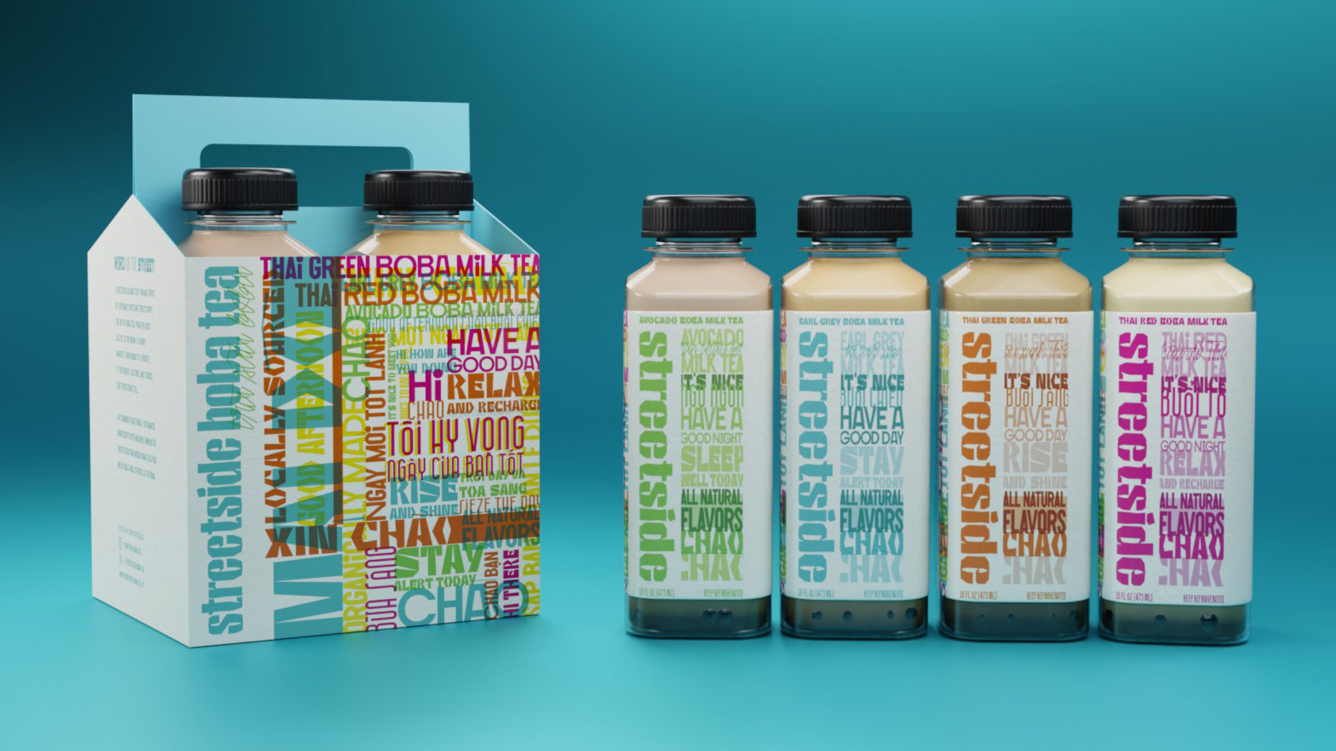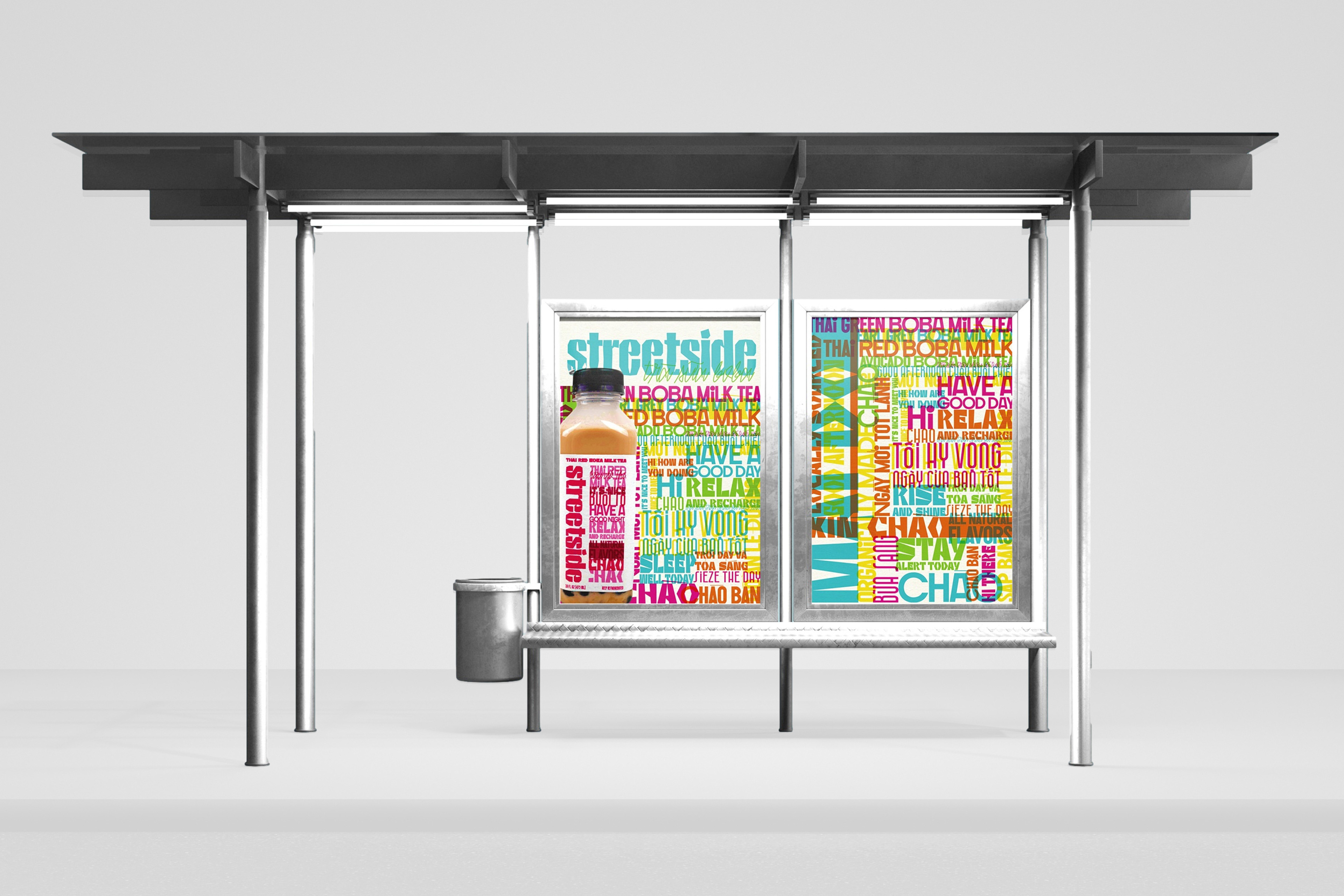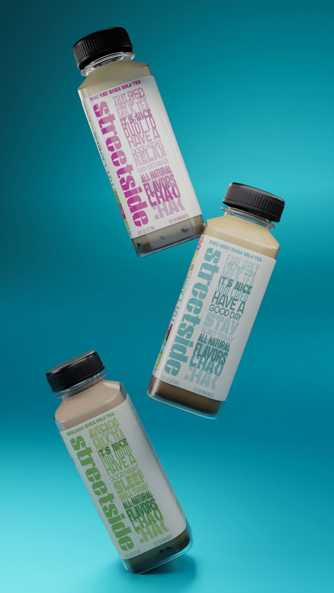 Streetside is a Vietnamese-inspired boba tea brand that captures the energy, warmth, and color of Vietnam’s bustling street culture. The brand draws direct inspiration from Vietnamese street signs - their layered typography, bright palettes, and handwritten charm. The phrases printed on the bottles - such as “It’s nice to meet you”, “Have a good day”, and “Chào” - are real greetings and expressions that vendors often say to tourists, making every bottle feel like a friendly moment shared on the street. Visually, the identity embraces bold typographic compositions, overlapping languages, and vibrant, contrasting hues to evoke the atmosphere of Saigon’s night markets and Hanoi’s bustling alleys.
