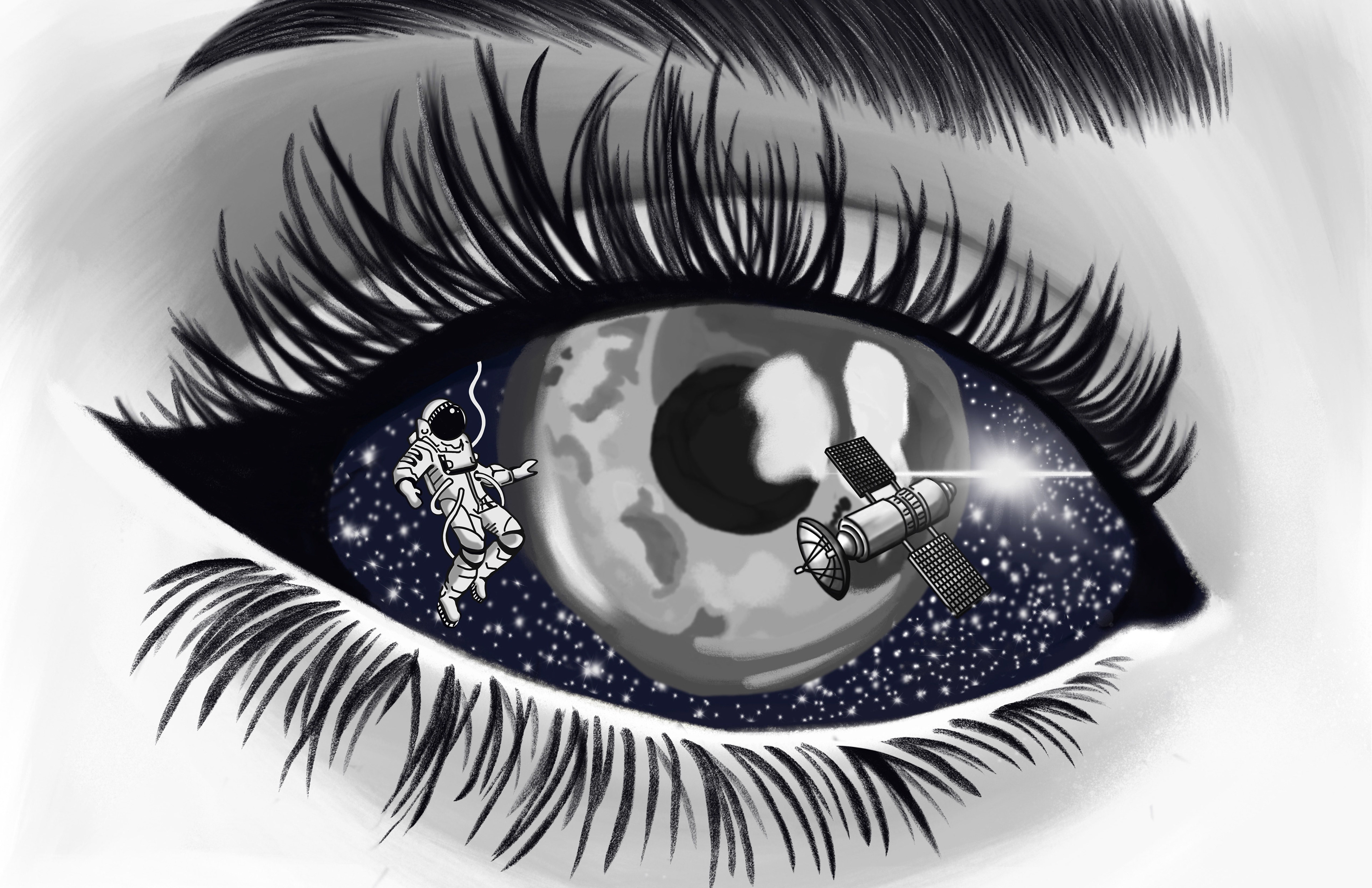 Talking To The Moon is a surrealist illustration that wonders what the world would be like if each person held the moon and the stars in their eyes. It symbolizes the beauty in the ordinary and natural.
